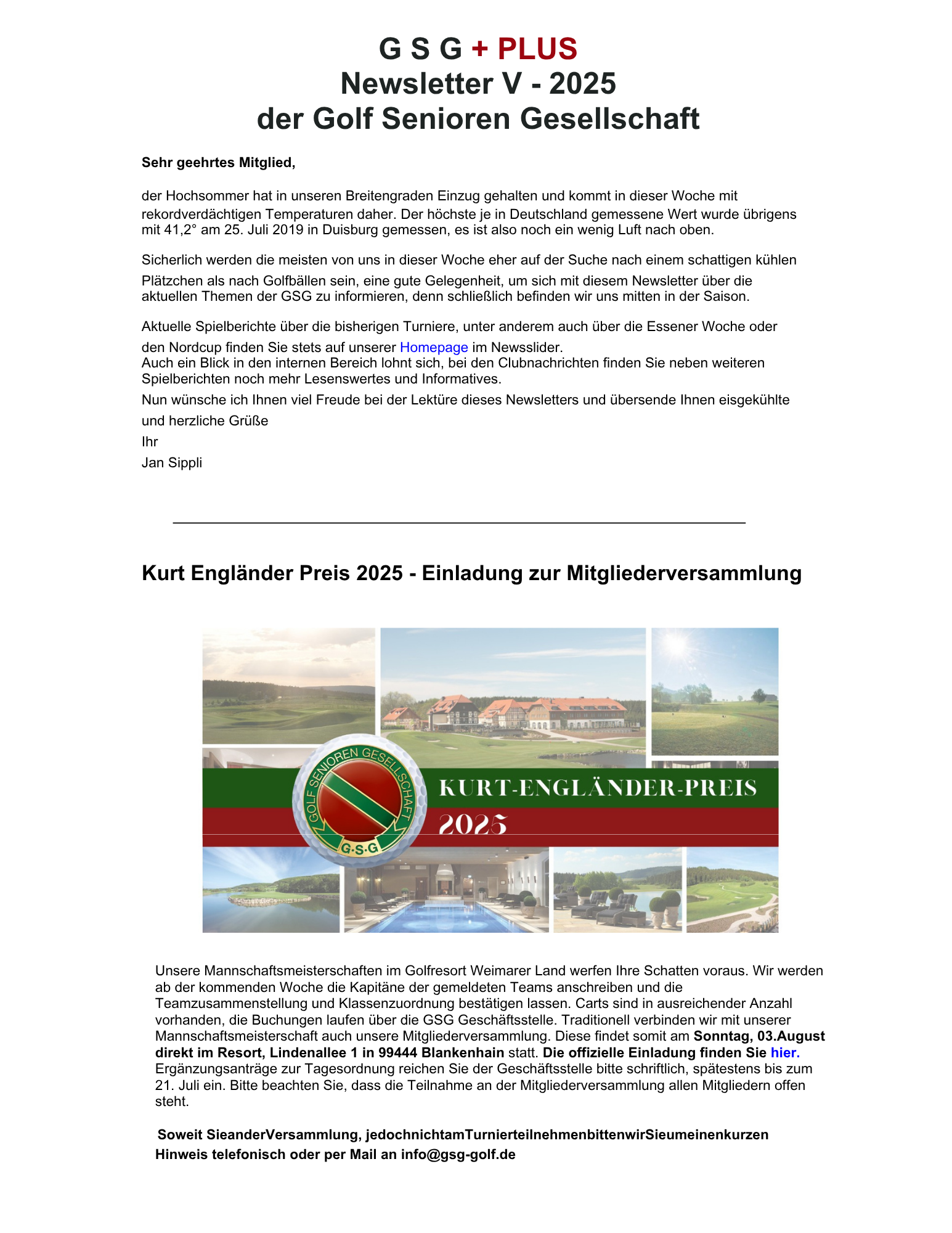 GSG Newsletter Juli Veröffentlicht am 3. Juli 2025 von jengoetze Anbei finden Sie den aktuellen Newsletter der GSG Geschäftsstelle nebst der Einladung zur diesjährigen Mitgliederversammlung in Weimar. Aufgrund des Umfangs ist dieser Newsletter als Einzel PDFs (5 Seiten) abrufbar. Seite 1 Seite 2 Seite 3 Seite 4 Seite 5 Einladung zur MV 2025