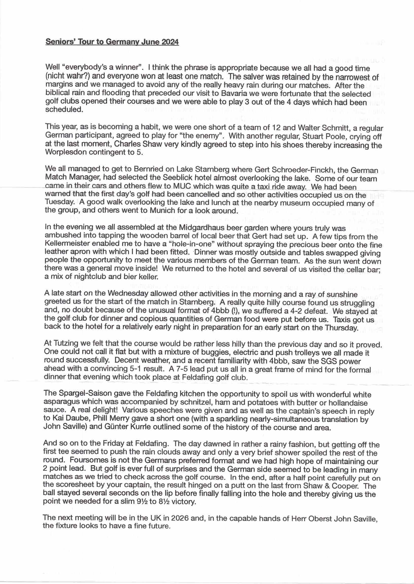 Die Durchführung des Freundschaftstreffens stand lange Zeit auf des Messers Schneide, denn die starken Unwetter in Bayern sorgten im Vorfeld für viele Sorgenfalten. Der erste geplante Spieltag im GC Starnberg fiel dann auch tatsächlich buchstäblich ins Wasser. Glücklicherweise konnten drei von vier geplanten Spieltagen, bei dann teils herrlichem Wetter, durchgeführt werden. Beide Nationen hatten mit kurzfristigen Ausfällen zu kämpfen. Das deutsche Team wurde durch Michael Schramm komplettiert, für das britische Team sprang Walter Schmitt ein, der temporär den britischen Pass annahm.