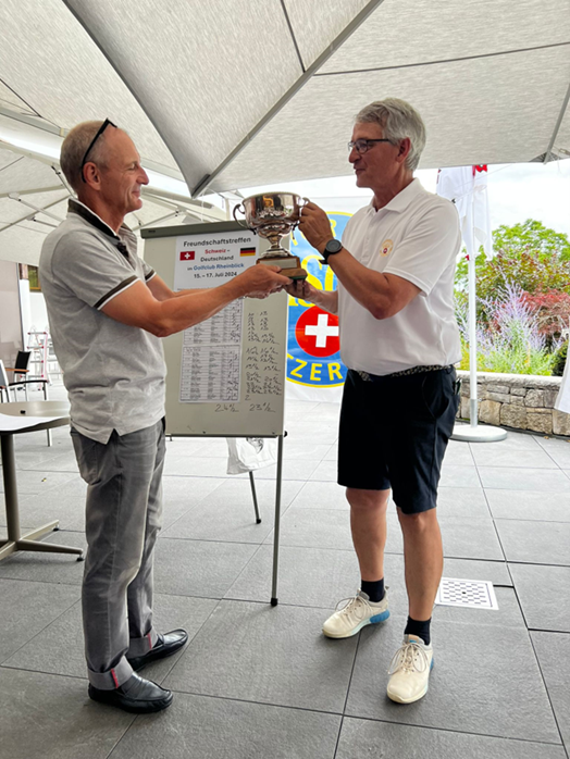 Wie immer mussten die 32 Einzel-Matchplays am Mittwoch das Treffen entscheiden. Es blieb äußerst eng und ausgeglichen. Nach 31 von 32 Matches stand es unentschieden mit 23,5 zu23,5 und erst das letzte Einzel entschied zugunsten der Schweiz – Endstand 24,5 zu 23,5! Allen war natürlich mehr denn je klar, dass «Sieg oder Niederlage» nebensächlich waren. Alle Beteiligten durften 3 der schönsten Tage des bisher so verregneten Jahres freundschaftlich zusammen verbringen und wir fühlten uns dabei fast wie eine große Familie.