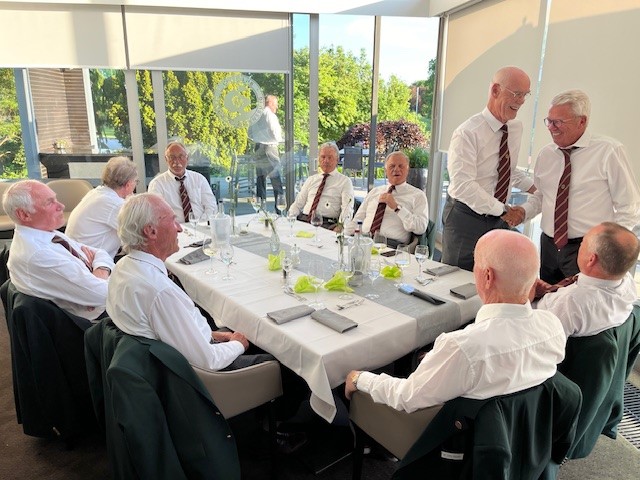 Die Begrüßung übernahm Lutz Donner, der den erkrankten Ahrensburger GSG-Kapitän Jürgen Wahl vertrat. Im Anschluss an Spargel mit Schinken und süßem Nachtisch waren alle auf die Spielergebnisse gespannt. Lutz Donner übernahm auch diesen Part und konnte sich gleich selbst mit seinem Spielpartner Jacominus Koek und 42 Nettopunkten zum 1. Nettoplatz gratulieren. Die Paarung Peter Thies und Helmut Schawe erspielten das 2. Netto mit nur einem Punkt weniger. Dritte mit 39 Punkten wurden Jan Bonte und Dr. Hermann Krämer. Bruttosieger mit 27 Punkten wurden Genc Zaman vom GC-Hittfeld und und Dr. Dieter Prädel vom GC-Holm. Alle Sieger und Platzierten erhielten ein graviertes Glas.