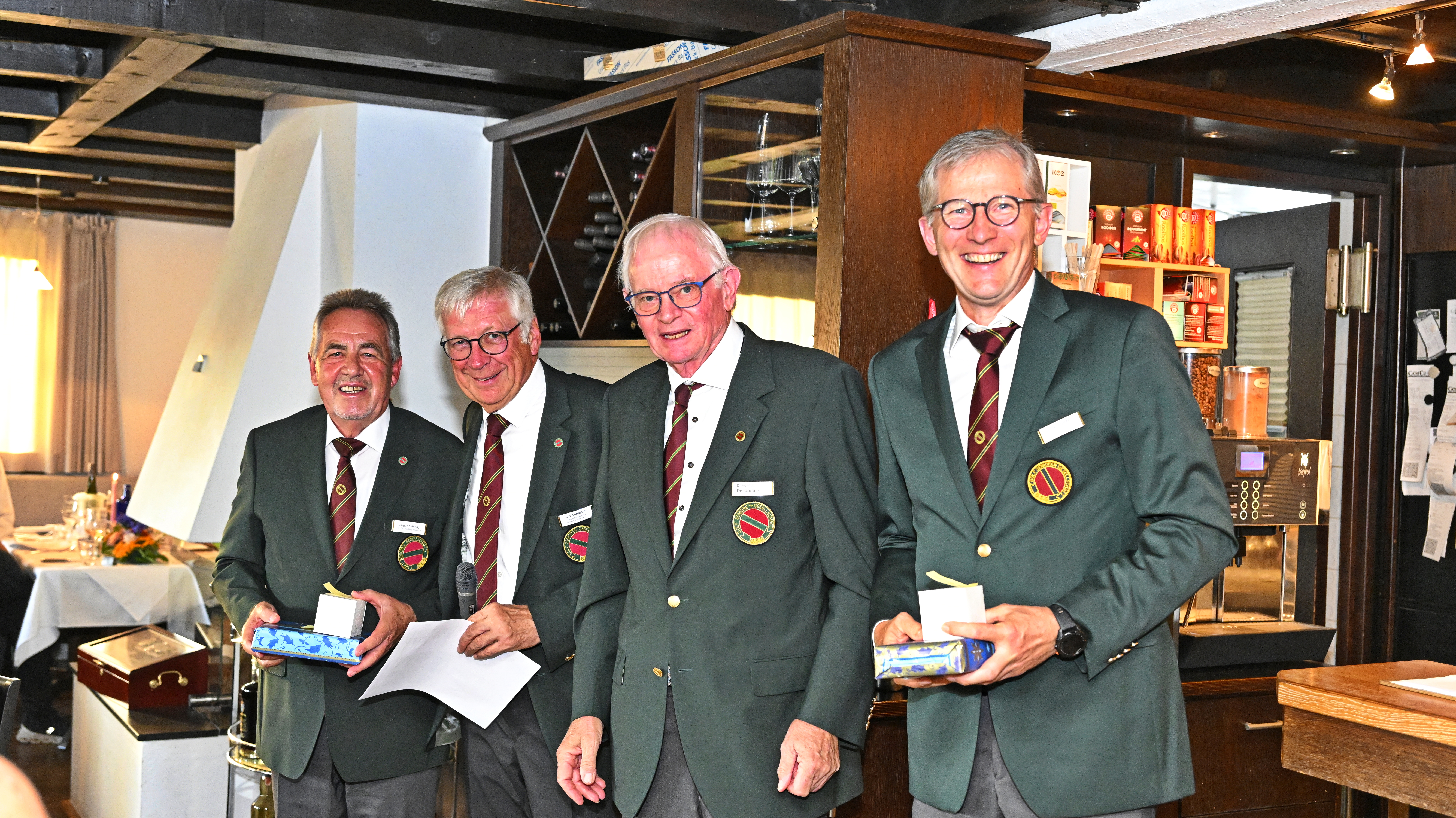 Vor dem Abendessen begrüßte Kapitän Dr. Helmut Deitermann alle Teilnehmer, die Sieger wurden vom Präsidenten des Clubs und zugleich GSGler, Carl Kuhmann, mit launigen Kommentaren geehrt. Das 1. Netto A sicherten sich Holger Jürgs und Berthold Mayntz (Bergisch Land), das 1. Netto B ging an Dr. Valentin Jug mit Harald Jedich (Hagen). Für den Bruttosieg nutzten Ludger Funke und Jürgen Feiertag ihren Heimvorteil.