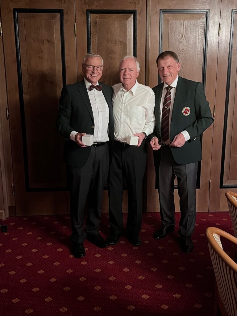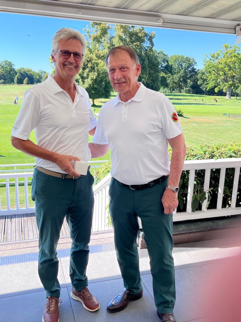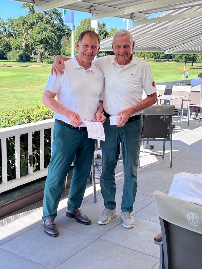 Beim Abendessen konnte Georg Wurzer dann neben zwei aus der Schweiz angereisten GSG-Freunden auch eine Gruppe vom GC Hanau bzw. Frankfurt begrüßen, die seit vielen Jahren in großer Mannstärke für die beiden Wettspieltage nach Neuburg zum Wittelsbacher GC anreisen. Den Nettosieg erspielten sich Alexander Zang und Wolf Niederwipper vom GC Hanau mit 41 Punkten vor dem Duo Dr. Richard Laible und Ditmar Staudt aus Liebenstein mit 38 Punkten. Georg Wurzer bat dann auch gleich Alexander Zang den Bruttopreis zu übergeben, denn diesen sicherten sich mit 22 Bruttopunkten die Gastgeber Georg Wurzer und Werner Halbig. In gemütlicher Runde, bei dem einen oder anderen Gläschen Wein, konnten viele gute Gespräche unter Freunden geführt werden, die wohl im Einzelfall auch etwas länger gedauert haben.